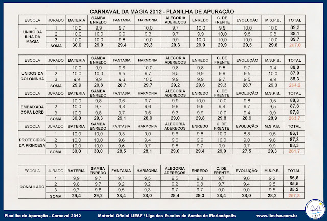 Confira abaixo a Planilha de Apuração - Carnaval 2012